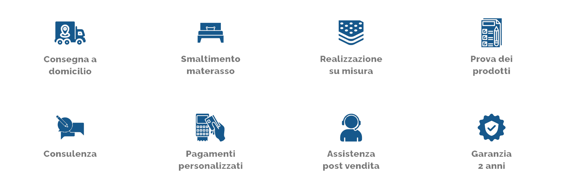 Tra i principali servizi offerti rientrano la consegna a domicilio, lo smaltimento gratuito del vecchio materasso, la realizzazione su misura, pagamenti personalizzati, assistenza post vendita e garanzia di due anni. Ogni fase è gestita con attenzione, per offrire un percorso chiaro e ben strutturato.