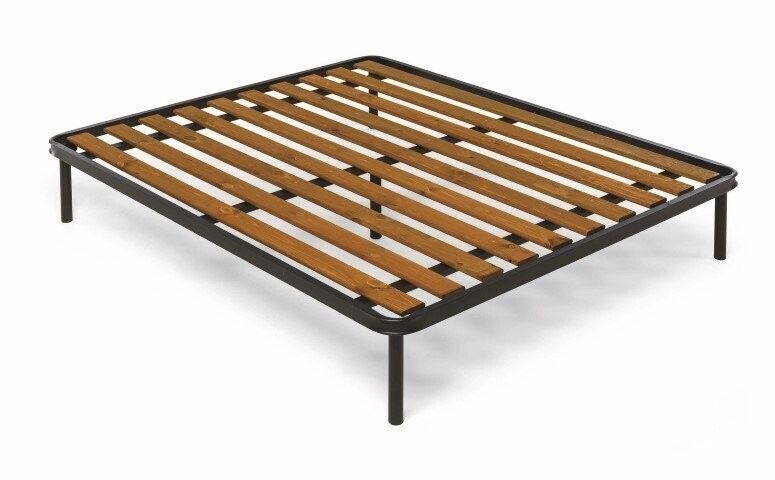 Struttura super ortopedica, telaio verniciato con polveri epossidiche mm 40 x 30 x 1,5 rinforzato con tre barre orizzontali dove poggiano le tavole in legno naturale, stondate e verniciate, bullonate in tre punti, per una rigidità totale e traspirazione del legno.
